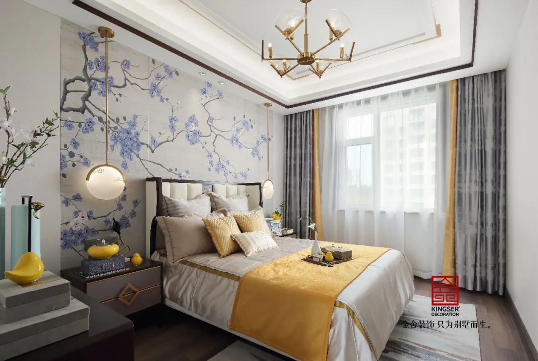 次臥以淡墨清研的枝頭壁布飾墻,配襯極具韻味的銀灰色亮光漆中式床頭柜,平添幾分時(shí)尚