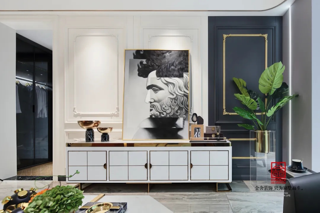 本案打破了傳統(tǒng)的新古典風(fēng)格,將元素簡(jiǎn)化到極致,讓風(fēng)格隨著居住者而變化,生活的味道自然會(huì)隨著設(shè)計(jì)的發(fā)展而不斷變化。新古典中“古典”這個(gè)詞是家居的核心,新古典風(fēng)格化繁為簡(jiǎn),從整體到局部,無(wú)論是精雕細(xì)琢,還是鑲花刻金都給人一絲不茍的印象。