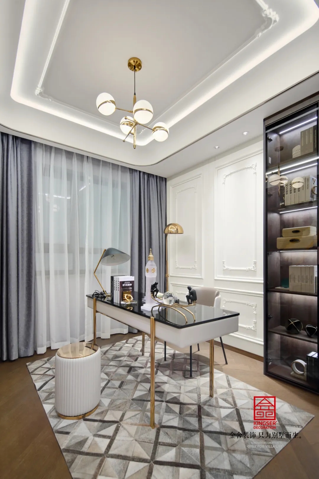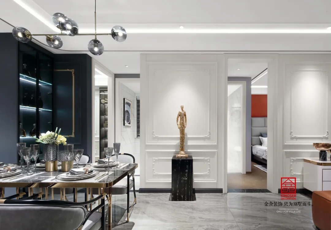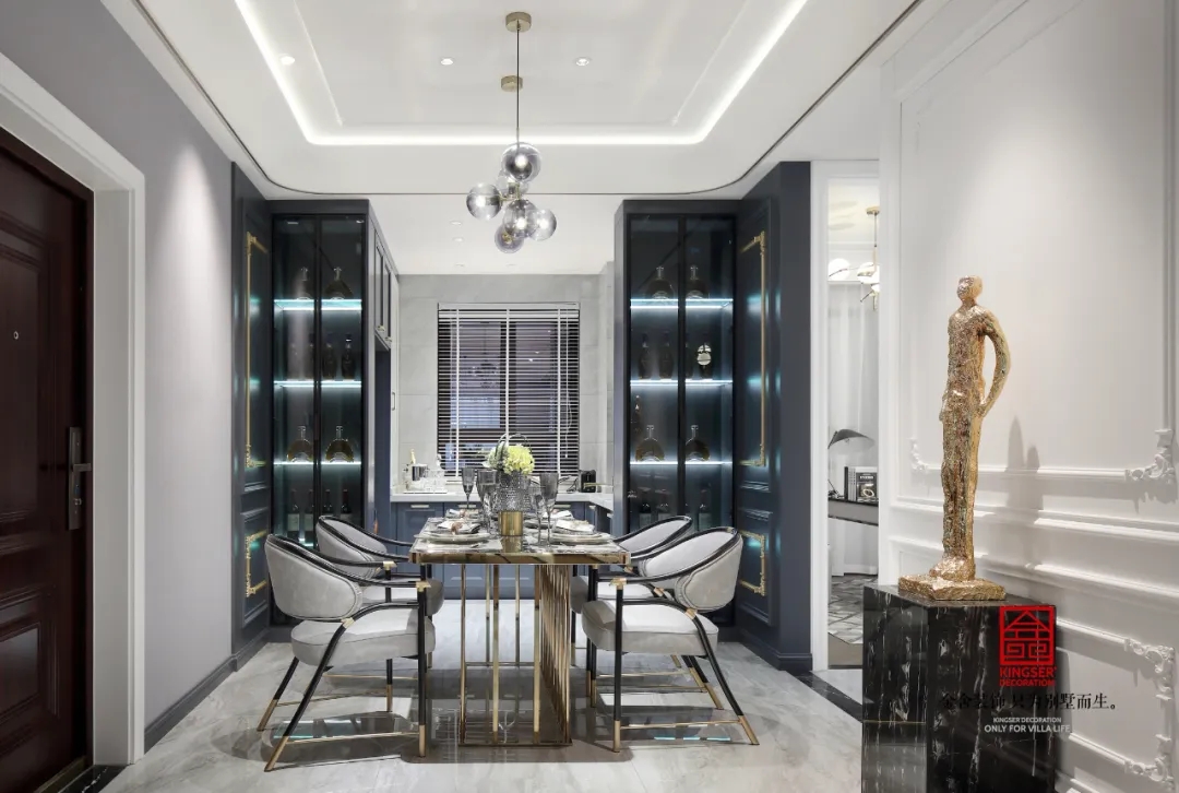 深藍(lán)、古銅和灰色調(diào)勾勒出紳士的高雅格調(diào)和品味。從空間利用到配色處理,匠心獨(dú)具,每一個(gè)空間都濃縮著設(shè)計(jì)師對(duì)新古典的獨(dú)特理解。