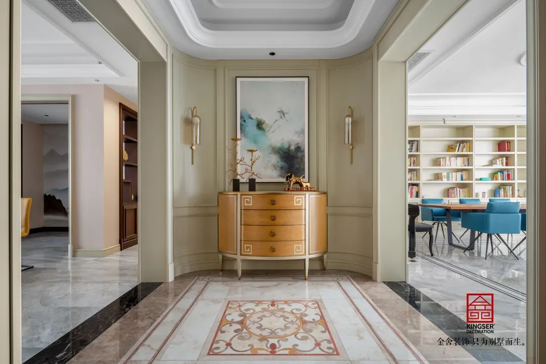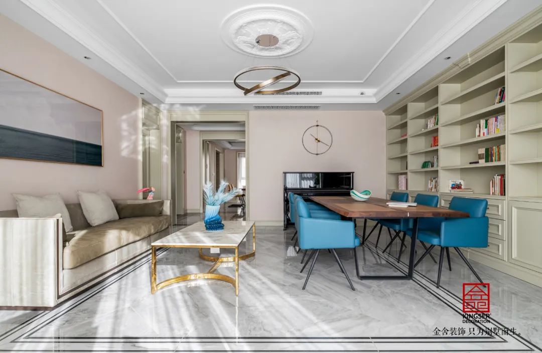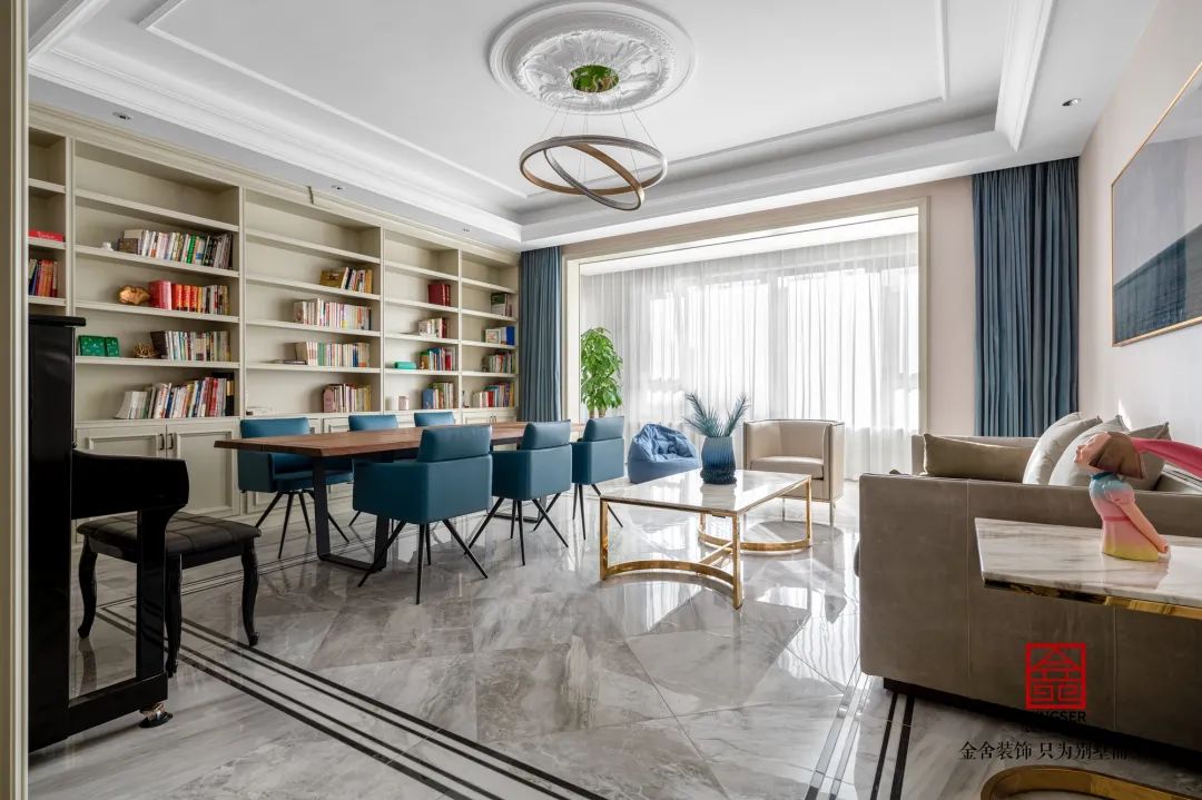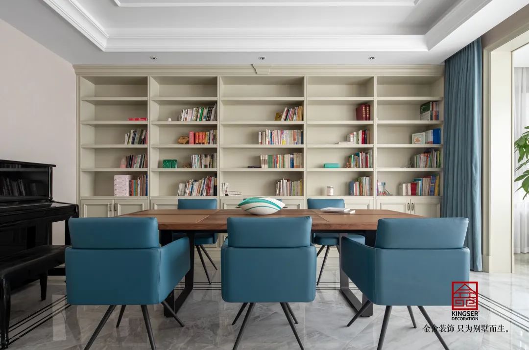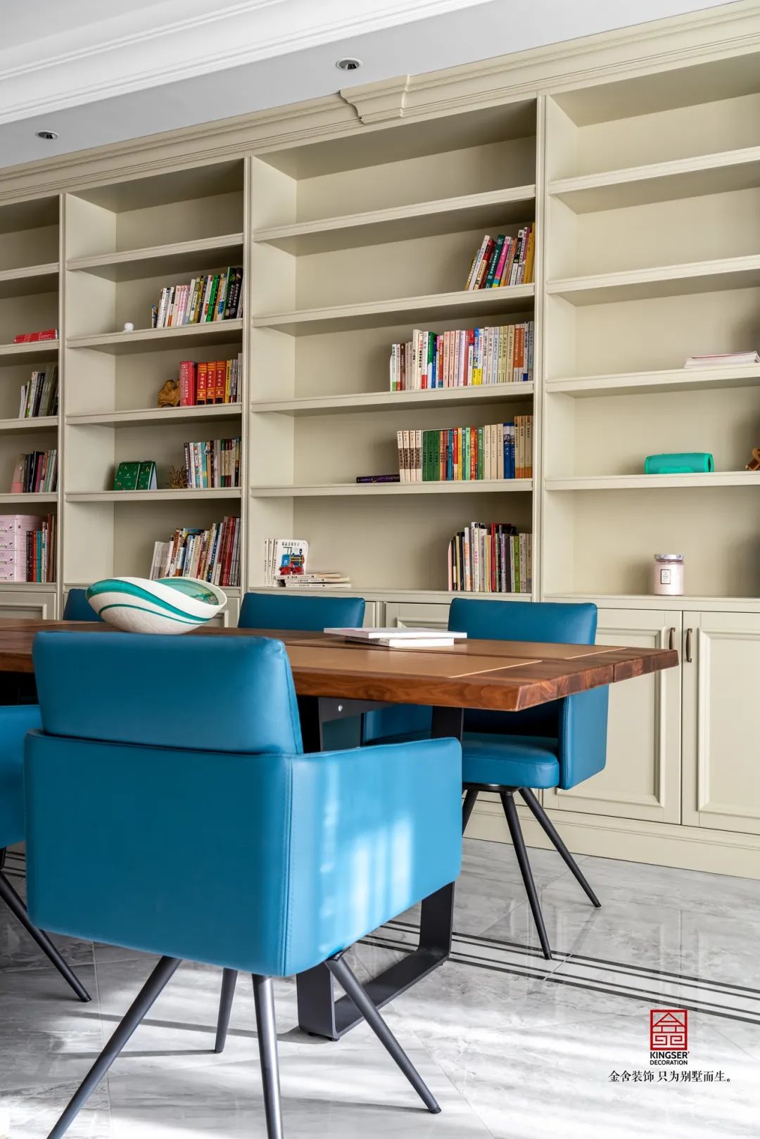 此案例為石家莊室內(nèi)裝修-榮盛華府200平米美式風格裝修案例實景。博爾赫斯曾經(jīng)說過:我心里一直在暗暗設想,天堂應該是圖書館的模樣。在家庭圖書館中,隨手捧起一本好書,沉浸在文字的世界里,與聰明人進行精神交流,這或許就是天堂應該有的模樣。