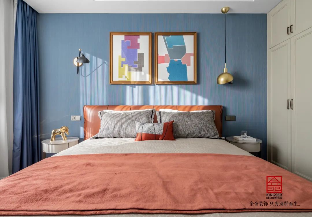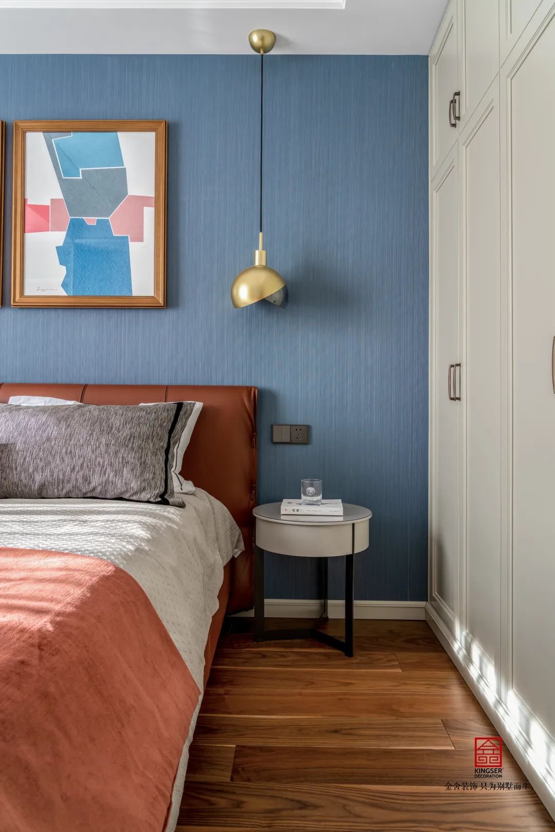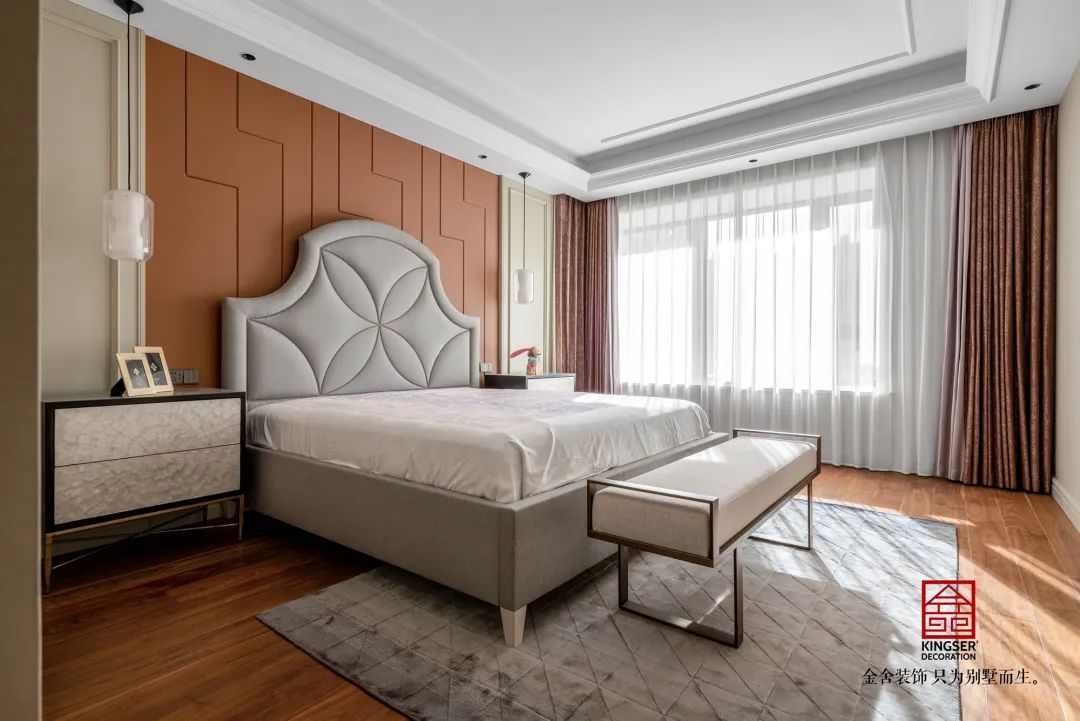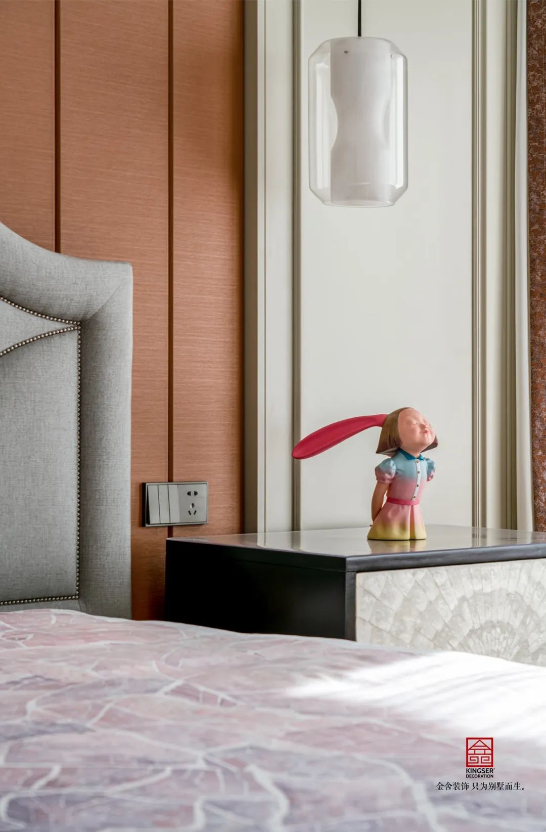 在臥室的設計上,強調的是舒展與放松,沒有刻意的豪華,但流露出精致的生活情調。大面積基底的布藝面料、皮革家具的簡單混搭,讓整個空間充滿自然神韻。