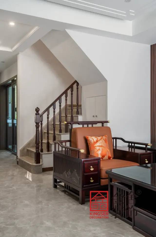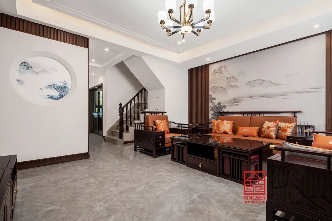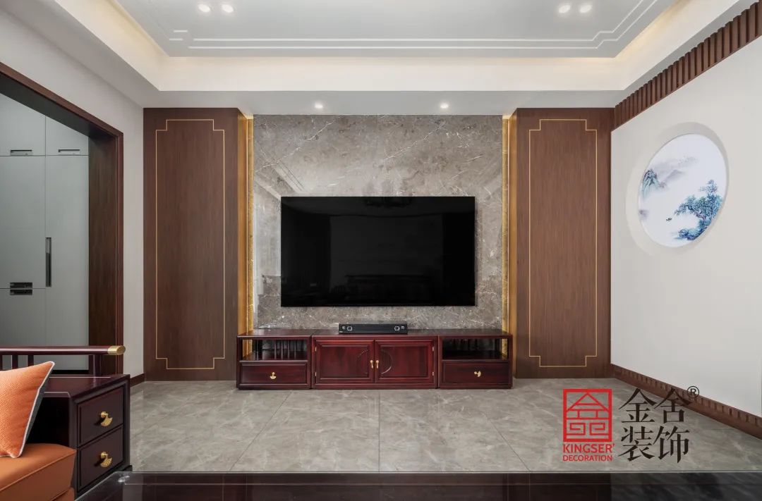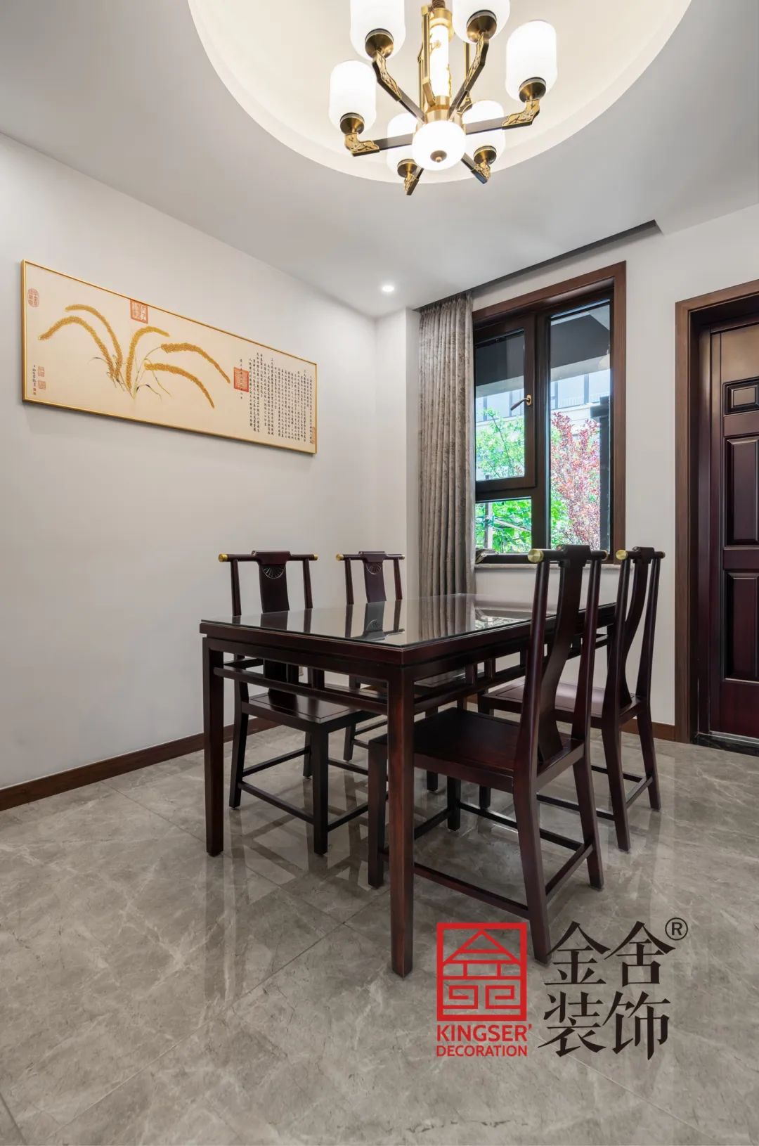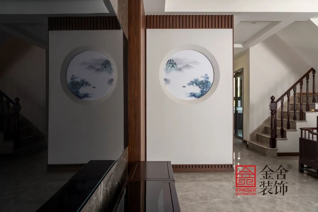 深沉的木色家具突出一種無限的時代感,白色,深木色,咖色,輔以一些清透,靈動的山水畫和木格柵于其中,體現(xiàn)現(xiàn)代中式中的含蓄之美,化繁為簡。同時背景墻的墨色山水與中式造景圓窗的存在也是一種東方特有的氛圍。