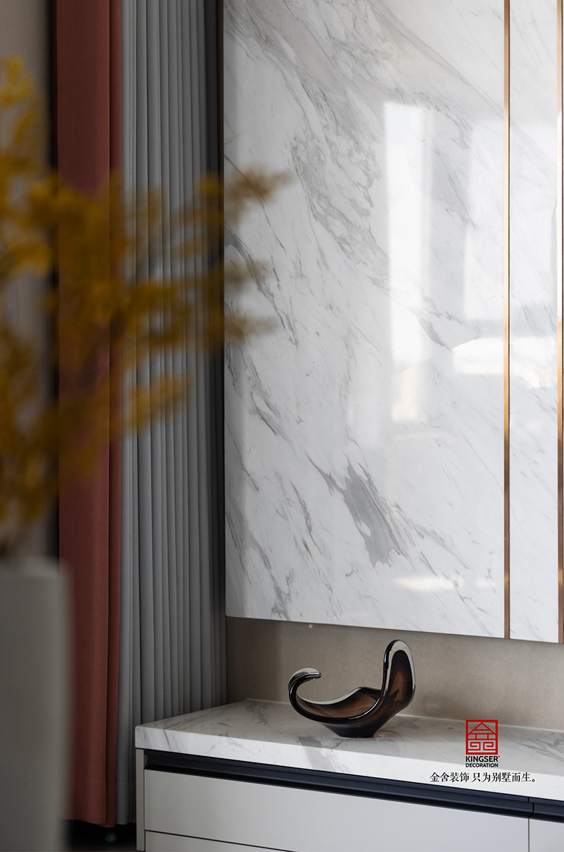 本案以優(yōu)雅與低奢的材質為主,柔和暖色調,打造輕盈的現代感。讓空間柔和而隱奢的氣質,成為當下年輕人群鐘意的設計風潮。