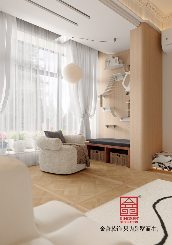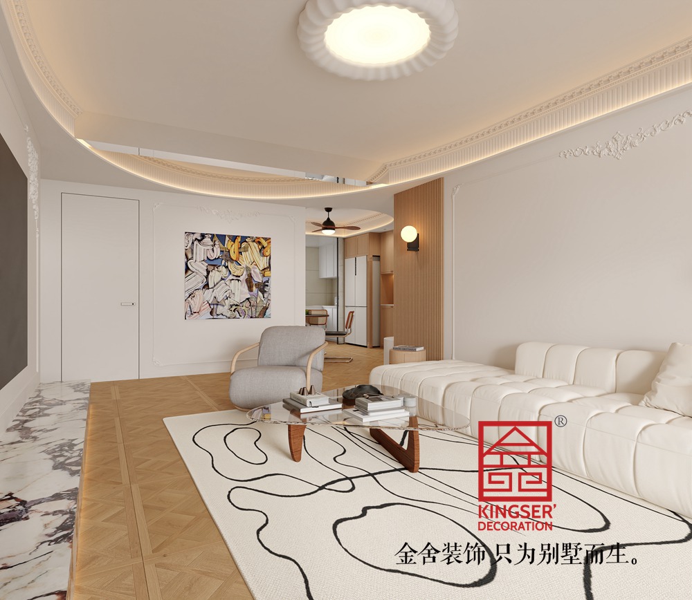 客廳內(nèi)部以米色和白色為主色調(diào),營造出一種清新、明亮且溫馨的氛圍。淺棕色的木地板與白色墻壁相得益彰,使空間看起來更加寬敞、整潔。同時,這些顏色也易于搭配各種家具和裝飾品,使客廳更加美觀。