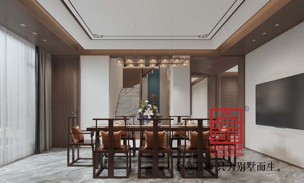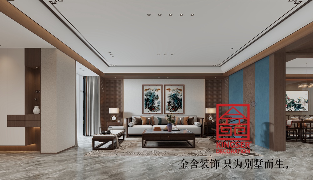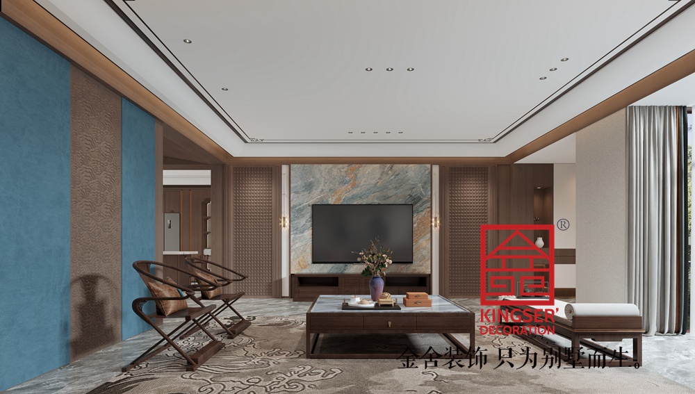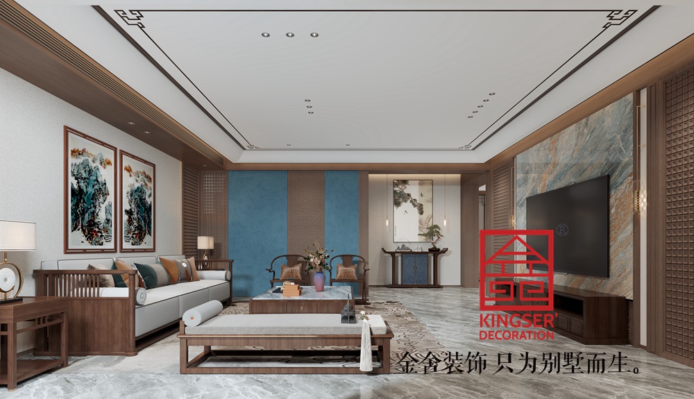此案例為石家莊裝飾公司-榮盛華府420平米中式風格裝修效果圖。本設(shè)計旨在打造一個簡潔而優(yōu)雅的現(xiàn)代客廳空間,以藍色和棕色為主色調(diào),營造出一種寧靜而溫馨的氛圍。通過合理的布局和精致的裝飾,讓客廳不僅具備實用功能,還能成為家庭成員聚會、放松和享受生活的場所。