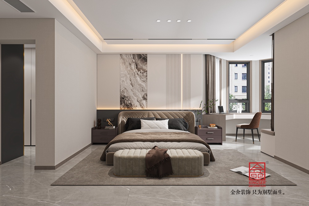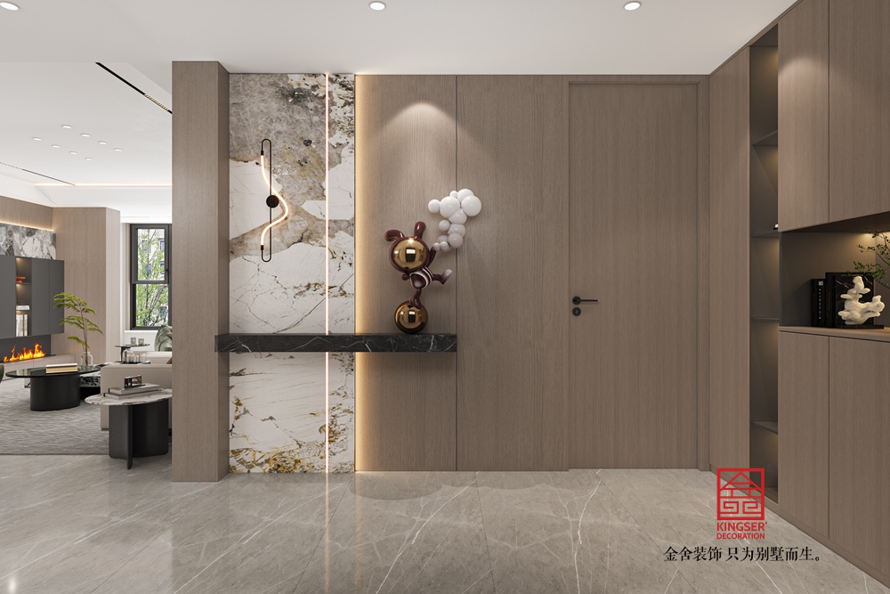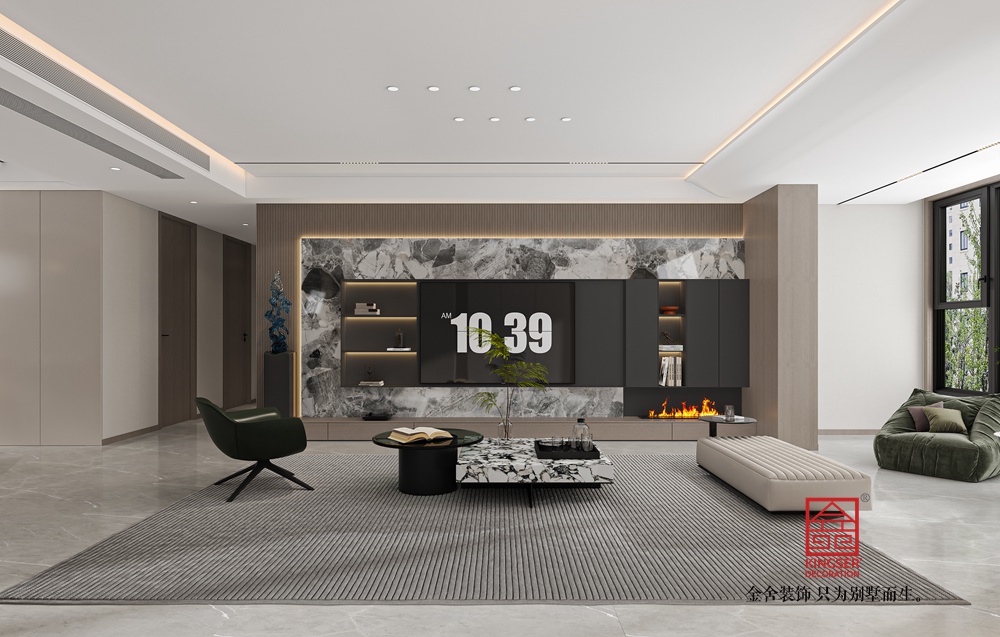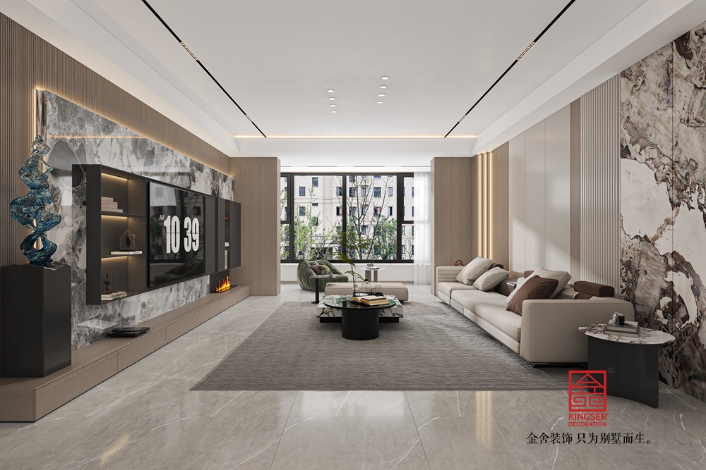 此案例為石家莊裝飾公司-維多利亞228平米現(xiàn)代極簡風(fēng)格裝修效果圖。設(shè)計旨在打造一個現(xiàn)代簡約風(fēng)格的客廳,注重空間的開闊感與時尚氣息,同時融入大理石紋理的自然元素,為居住者提供一個既舒適又優(yōu)雅的休憩環(huán)境。