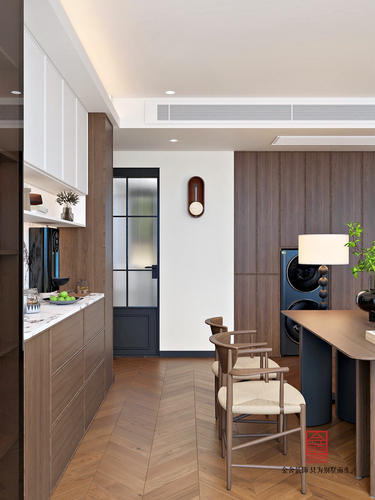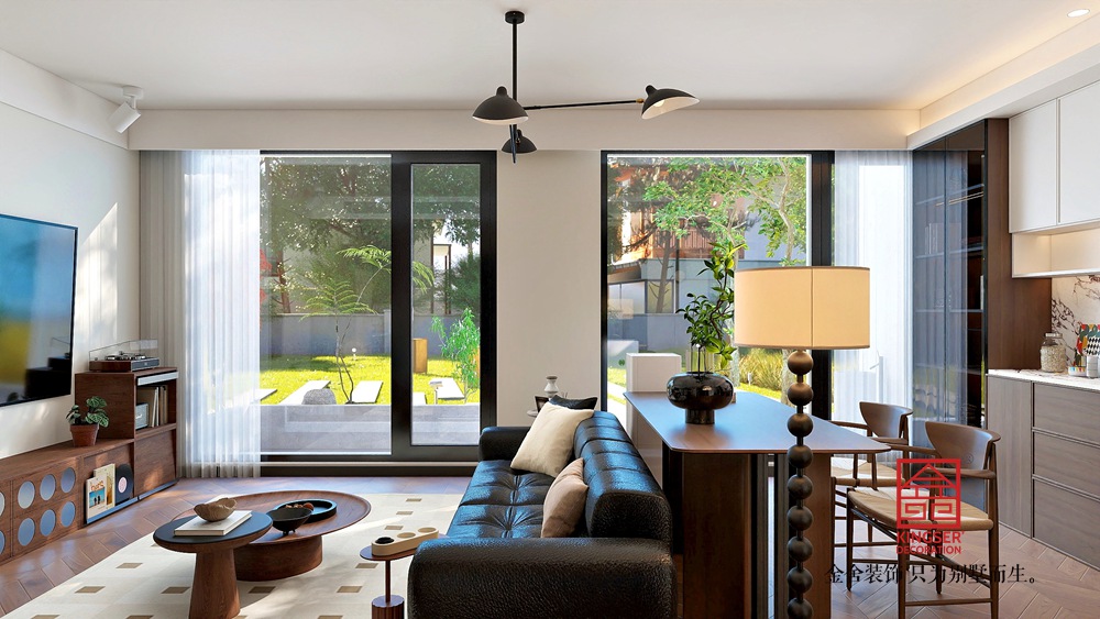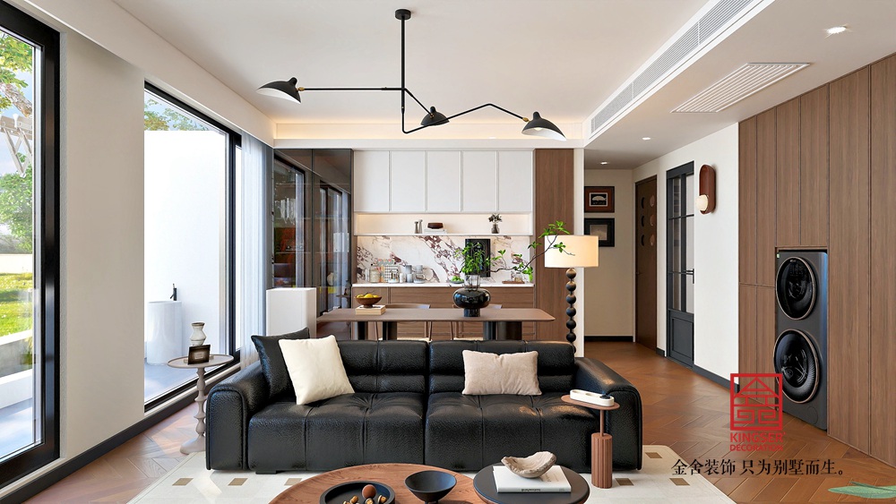 墻面淺調(diào)營造溫潤基底,木質(zhì)護(hù)墻與家具傳遞自然質(zhì)樸,黑色皮質(zhì)沙發(fā)沉淀經(jīng)典,金屬燈具線條勾勒復(fù)古精致,石材、綠植點(diǎn)綴增添層次,復(fù)古音響則成為空間的靈魂符號,喚醒歲月記憶。