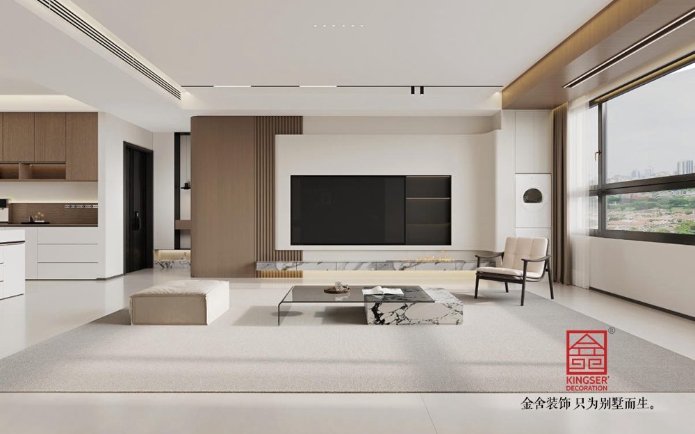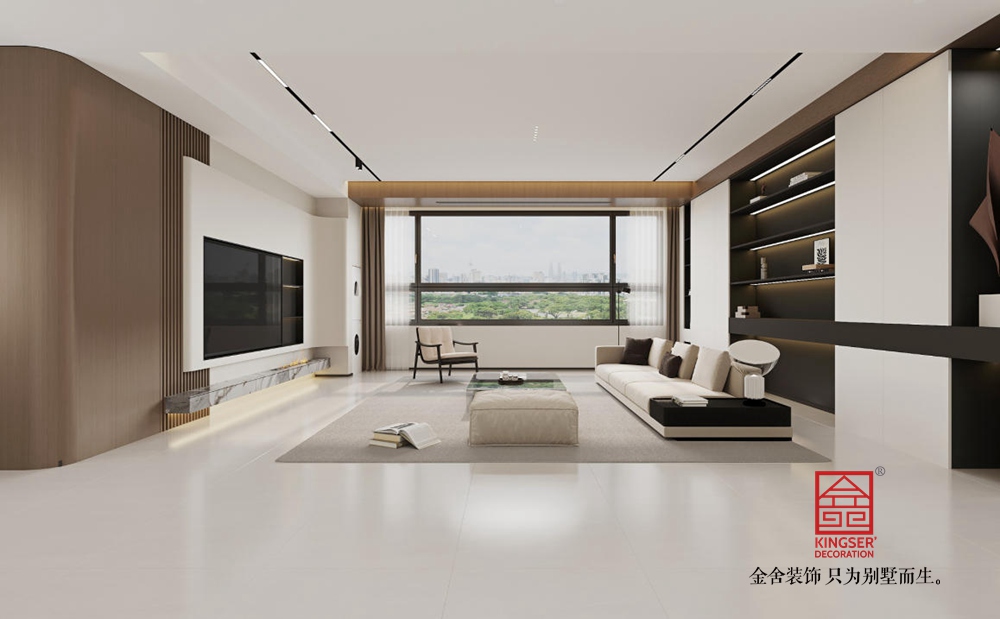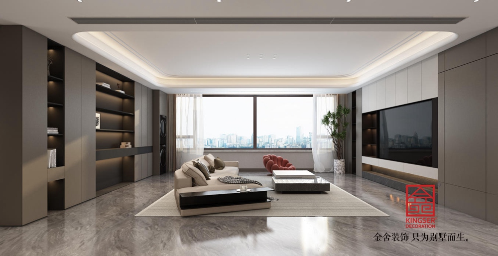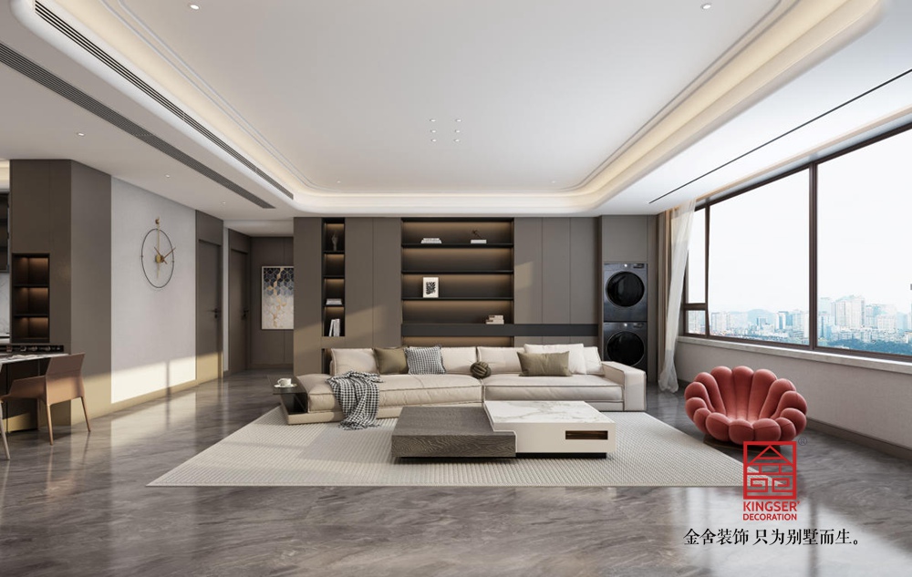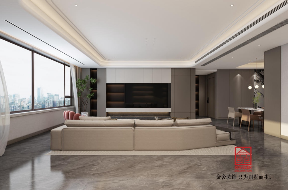 空間布局上,采用開放式設計,讓客廳與周邊區(qū)域自然銜接,增強了空間的通透感與互動性。大面積的落地窗是設計亮點,引入充足自然光線,同時將城市景觀納入室內(nèi),使空間與外界環(huán)境有機融合。