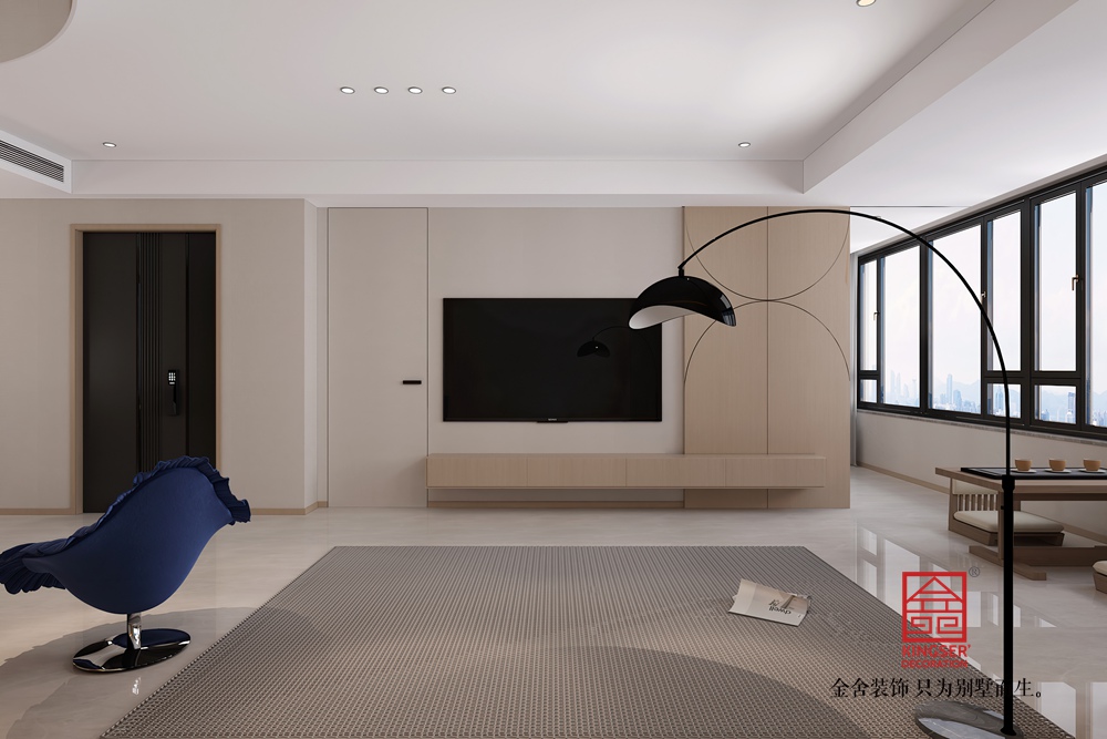 家具選擇上,淺灰沙發(fā)搭配色彩點(diǎn)綴的抱枕,與藍(lán)色休閑椅形成視覺對(duì)話,既保證了舒適的使用體驗(yàn),又豐富了空間層次。簡約的落地?zé)艉碗娨暠尘皦υO(shè)計(jì),在滿足功能需求的同時(shí),讓空間保持利落通透。整體布局開闊,動(dòng)線流暢,于簡約之中盡顯雅致與實(shí)用,為居者打造出一個(gè)放松身心、享受生活的理想場所。