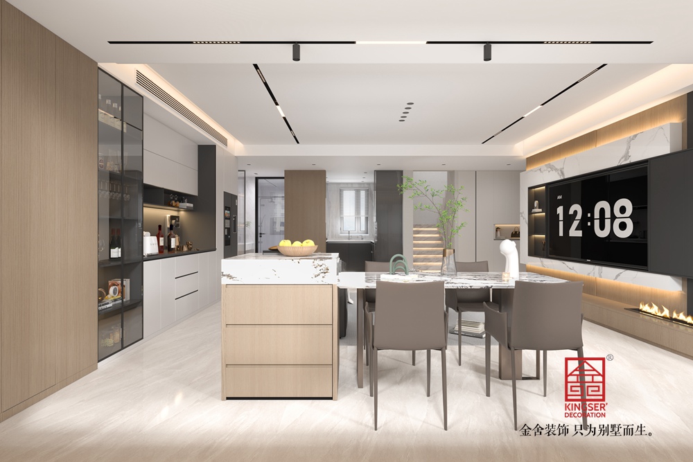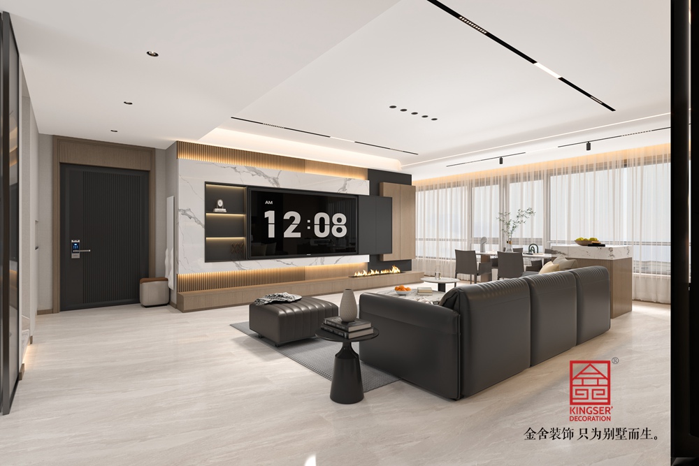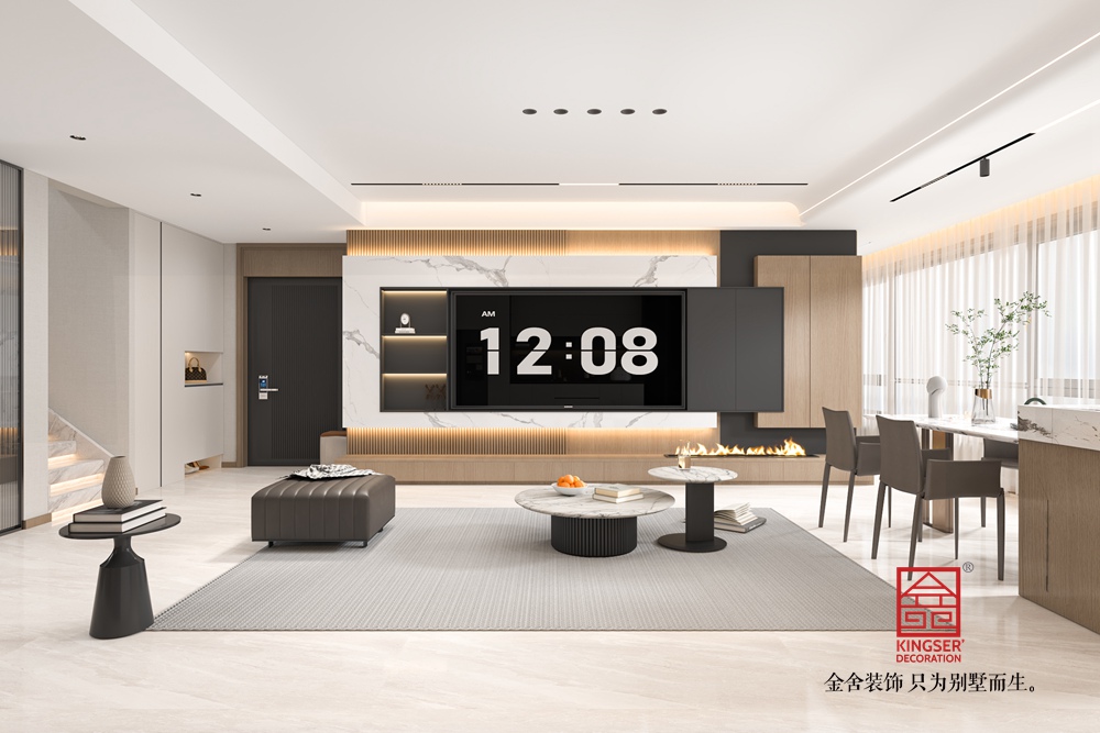 電視背景墻設(shè)計(jì)頗具亮點(diǎn),大理石紋理與木質(zhì)線條結(jié)合,輔以暗藏?zé)魩В蕊@高級(jí)質(zhì)感,又通過(guò)光影增強(qiáng)了空間的溫馨感。家具選擇注重線條簡(jiǎn)潔與材質(zhì)質(zhì)感,淺灰地毯柔化空間,各式桌椅、邊幾等造型簡(jiǎn)約卻不失精致,為空間增添了時(shí)尚氣息。
