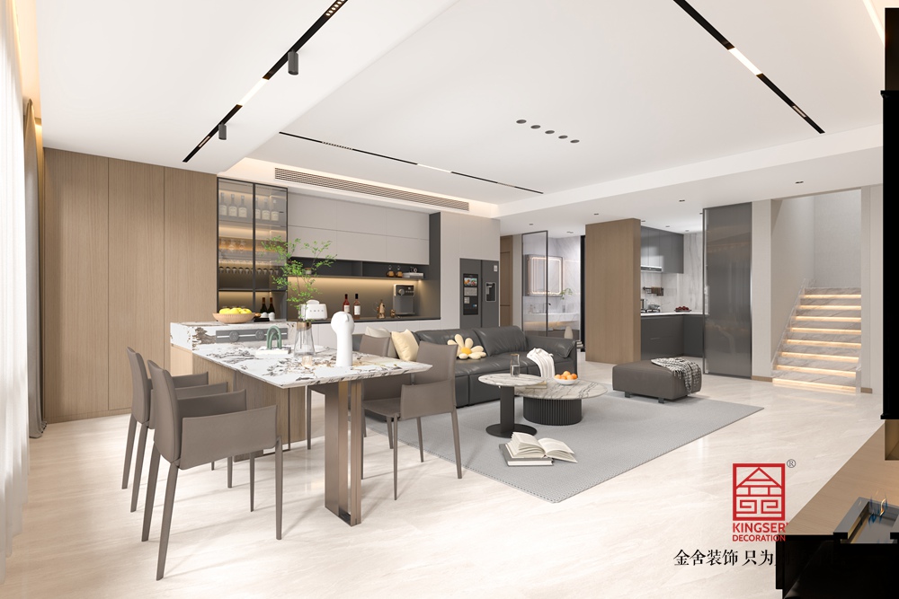 空間布局上,功能分區(qū)明晰??蛷d作為核心區(qū)域,搭配餐廳,滿(mǎn)足日常起居與社交需求。整體色調(diào)采用柔和的中性色,如淺米色墻面、木質(zhì)元素,搭配深灰家具,形成和諧且富有層次的視覺(jué)效果。