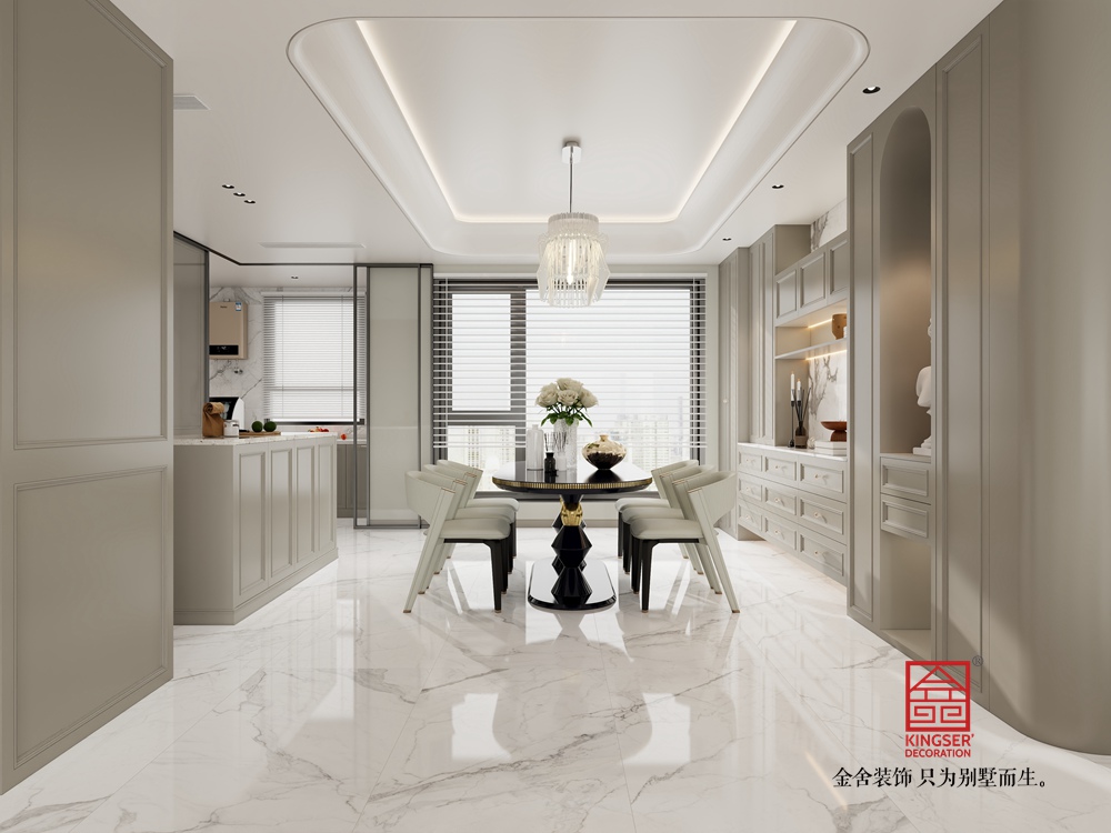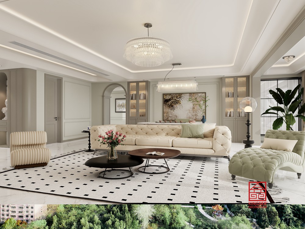 本客廳設(shè)計(jì)融合了現(xiàn)代輕奢與優(yōu)雅格調(diào)。以柔和的淺色調(diào)為主基底,營(yíng)造出溫潤(rùn)雅致的空間氛圍。精致的水晶吊燈與線條流暢的家具相得益彰,彰顯出輕奢質(zhì)感。
