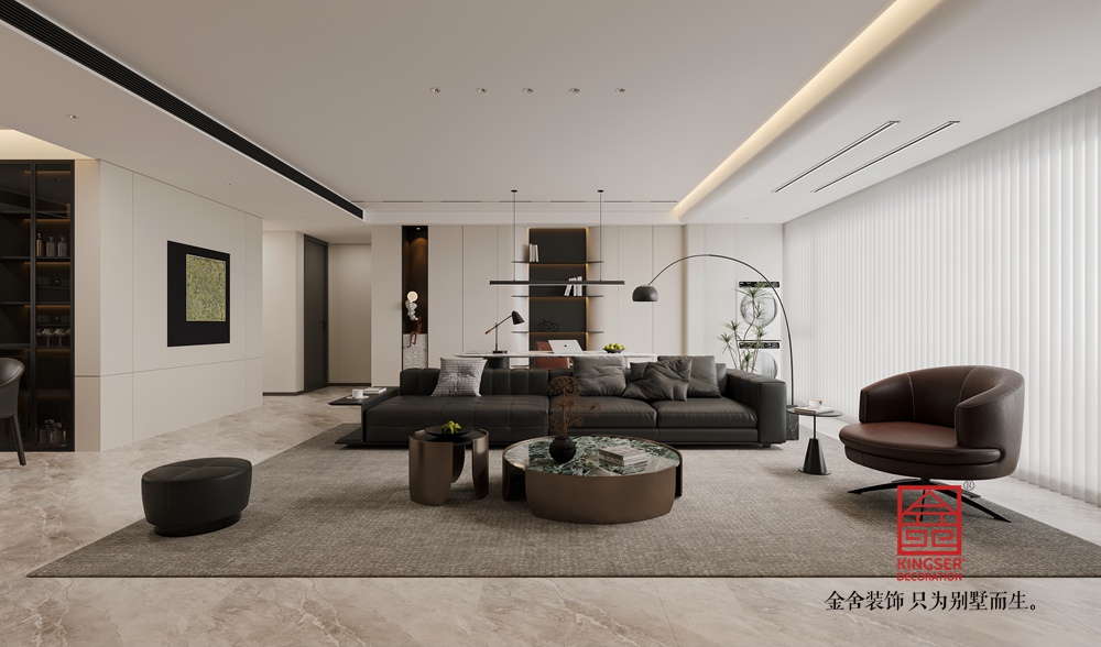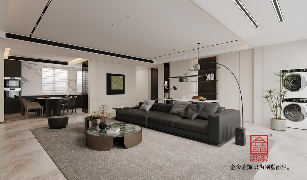 采用開(kāi)放式設(shè)計(jì)邏輯,將客廳與周邊功能區(qū)(如書(shū)房區(qū)域)自然銜接,既保證空間的通透感,又通過(guò)家具的布局形成視覺(jué)層次。無(wú)主燈照明系統(tǒng)結(jié)合線性燈帶與點(diǎn)光源,弱化空間壓迫感,同時(shí)利用光影塑造出柔和且富有格調(diào)的氛圍。