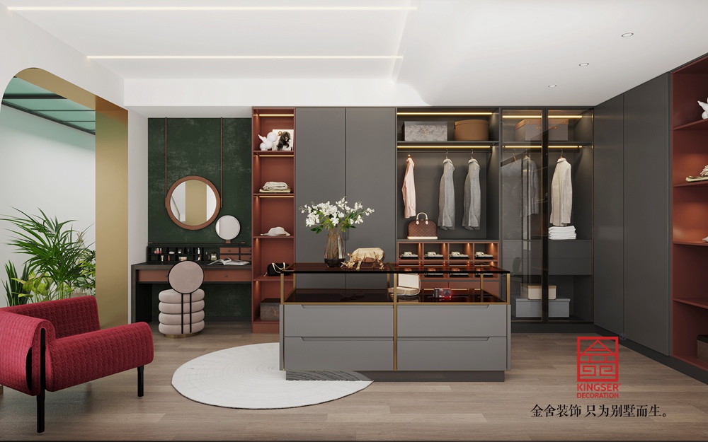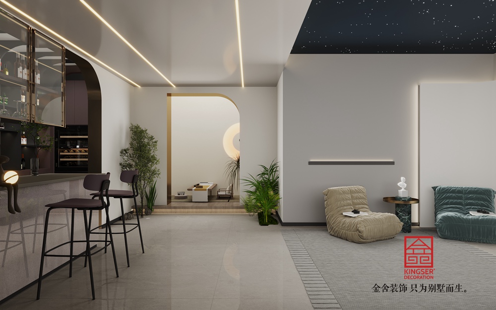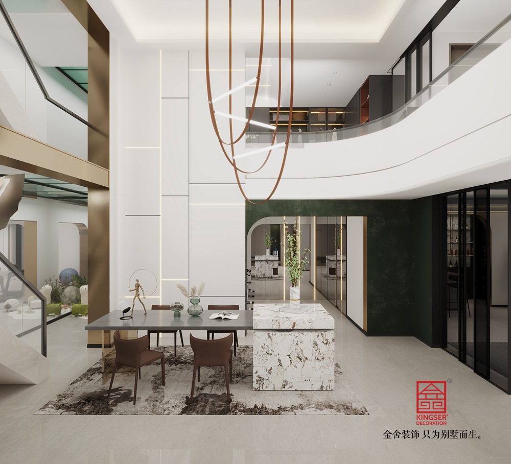 以現(xiàn)代簡約為主導(dǎo),摒棄冗余裝飾,強(qiáng)調(diào)線條利落、形態(tài)純粹;通過金屬邊框、大理石肌理、絨布軟包等元素植入輕奢質(zhì)感,平衡“簡”與“奢”的邊界。主色調(diào)選用低飽和度的「米白、淺灰、暖棕」,奠定柔和雅致的底色;局部以「鎏金、深墨綠」等跳色強(qiáng)化視覺焦點(diǎn),再用亮色小面積點(diǎn)綴,激活空間活力卻不喧鬧。