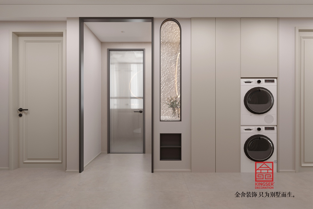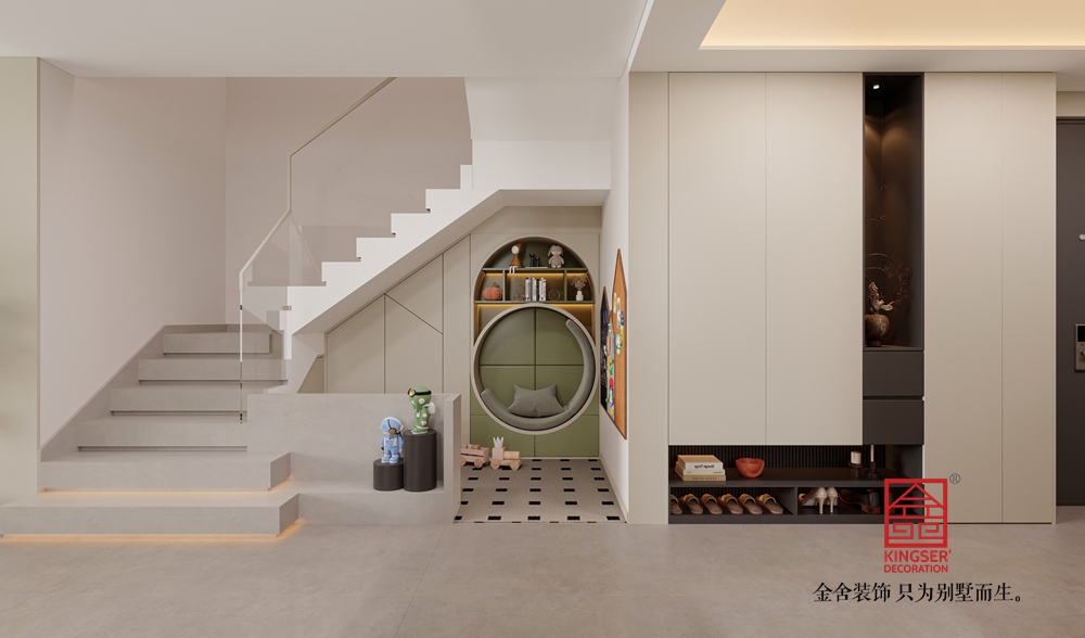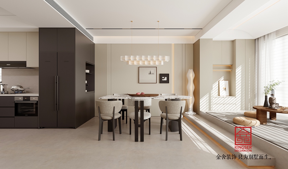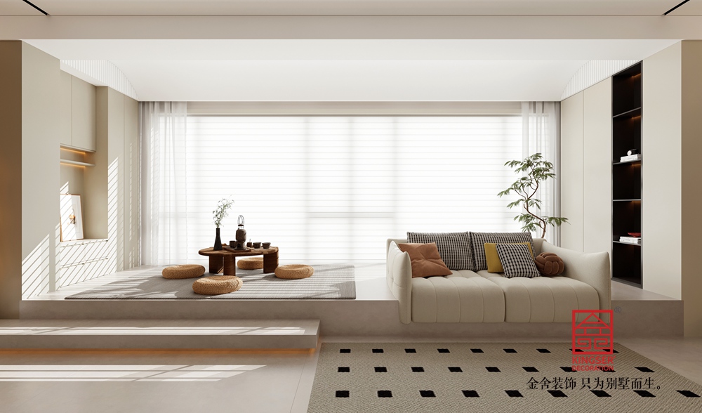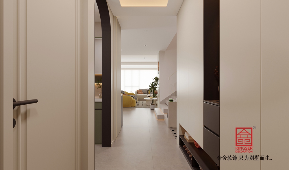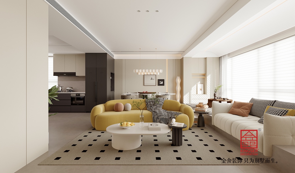 這個空間以 “現(xiàn)代簡約 + 輕暖治愈” 為核心風(fēng)格,整體以米白、淺褐為柔和基底,通過明黃色弧形沙發(fā)作為視覺焦點,搭配黑白棋盤格地毯與撞色抱枕,在低飽和基調(diào)中注入活潑張力,而廚房深灰柜體則形成沉穩(wěn)對比,平衡空間輕重;同時以通頂柜、隱形門強(qiáng)化整潔感,無主燈、線性燈帶與懸浮吊頂提升輕盈度,柔紗簾過濾出柔和光線,再配合客餐廚一體化的互動布局,以及圓潤茶幾、藝術(shù)擺件等兼顧舒適與精致的軟裝選品,既適配日常休閑場景,也傳遞出松弛且高級的生活質(zhì)感。