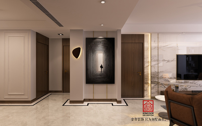 此方案業(yè)主為年輕新婚夫婦,對新家有無限的美好憧憬,所以在出設(shè)計方案的時候更注重顏色以及燈光的舒適度。沒有做太多復(fù)雜的造型,只是用天然石材以及護(hù)墻板的木紋紋理來襯托出現(xiàn)在風(fēng)格的時尚氣息。地面瓷磚的鋪貼方式也沒有采用傳統(tǒng)的分空間區(qū)域的方式來做造型拼花,而是采用了對工人師傅施工工藝要求很高的波導(dǎo)線繞墻鋪貼方式,這樣從視覺感上擴(kuò)大了整個空間的空間感。這樣也不會限制家具擺放的位置,后期家具進(jìn)場后可以根據(jù)業(yè)主自己的使用喜歡擺放不同的角度。