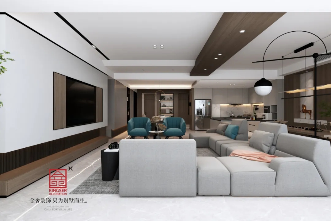 從造型上來說,家具和電視墻的造型都十分硬朗,點線面感強烈,在港式輕奢的基礎上還突出了一種極簡風的感覺。讓身處其中的人都能感受到設計師的畫面語言。