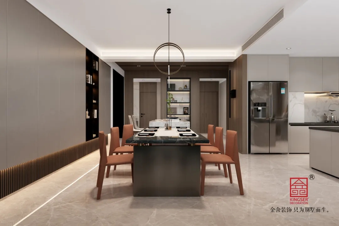 餐廳和客廳的整體顏色十分的和諧統(tǒng)一,馬鞍皮餐座椅搭配巖板島臺品質十足,拉起了整個空間的效果,橙色作為2021年的流行色,也是被越來越多人運用,橙色鮮眀透亮,在整個空間中起到了提高空間明度的效果。在低調內(nèi)斂中體現(xiàn)奢華的本質。這里日常忙碌的背影是生活中最無可替代的溫馨。