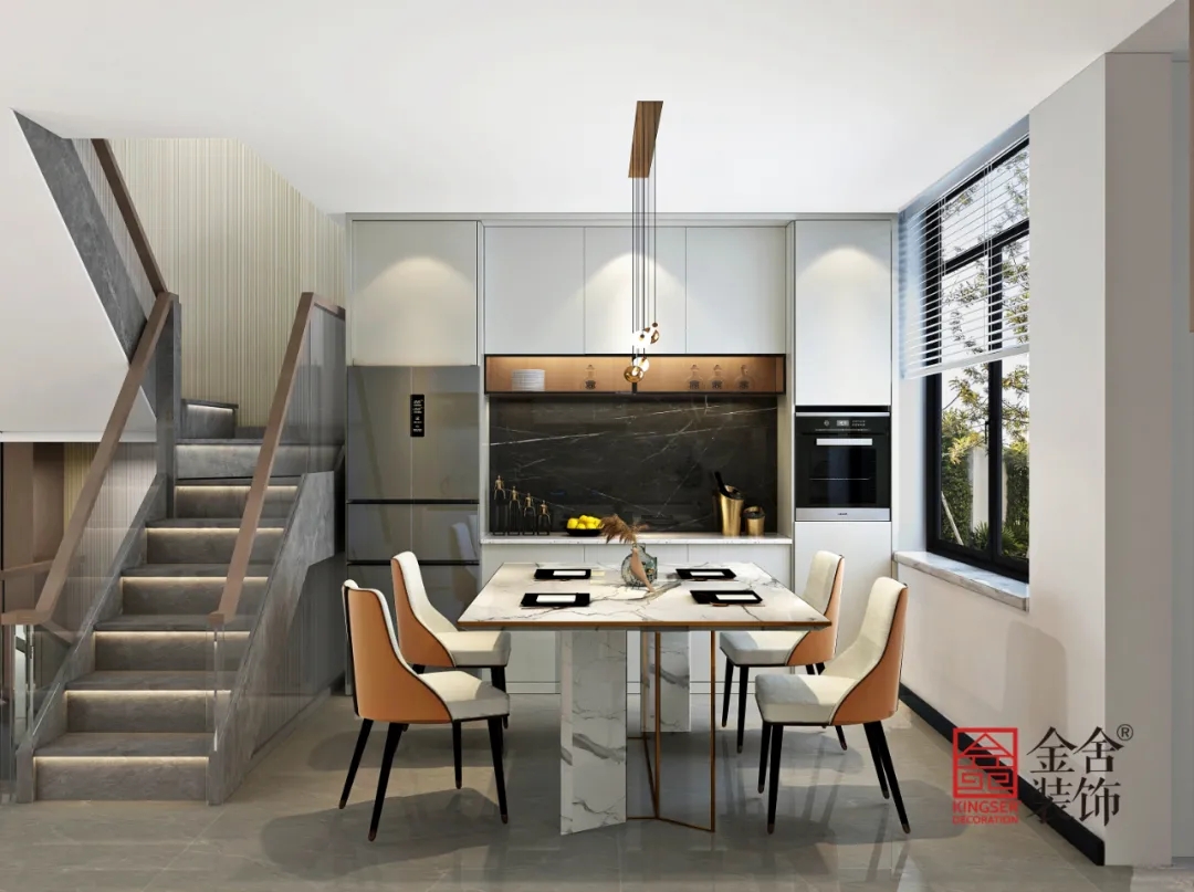 餐桌選擇巖板材質,搭配靚麗色彩的餐椅,冰箱和烤箱內嵌入餐邊柜,增強整體裝飾性和實用性。搭配精致優(yōu)雅的餐具組合,就餐空間具有滿滿的儀式感~