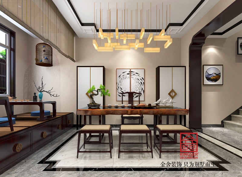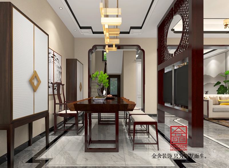 本案為金舍裝飾-碧桂園200平米新中式風(fēng)格裝修效果圖。位于石家莊碧桂園,林湖區(qū)。業(yè)主對中式文化情有獨(dú)鐘 喜歡喝茶愛書法。家人希望在中式的基礎(chǔ)上能夠讓家寬敞,明亮,溫馨且富有詩意。所以設(shè)計風(fēng)格最終定義為新中式。中式的古香古色與簡約的素雅輕盈結(jié)合,打造亦古亦今的空間氛圍,沒有傳統(tǒng)中式的深沉色彩和繁復(fù)裝飾;光線透過紗簾照到室內(nèi),柔和安靜。