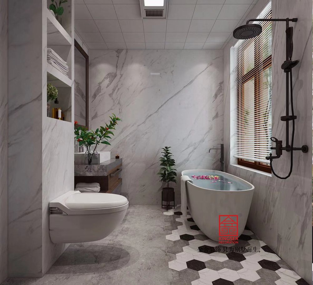 并非常見(jiàn)的干濕分離布局,而是只用了一塊玻璃來(lái)做隔斷,主要防止智能馬桶受潮,反而增加了新穎獨(dú)特的感覺(jué)。